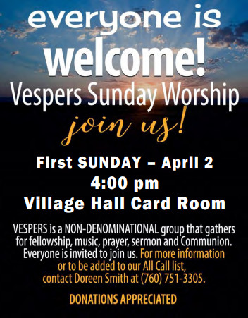 - Vespers Sunday Worship 1st Sun, 4:00pm Card Room